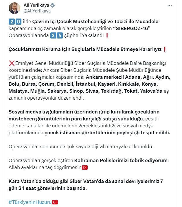 Bakan Yerlikaya, 20 ilde de çevrim içi suçlarla mücadele kapsamında "Sibergöz-16" operasyonu yapıldı. Ankara merkezli gerçekleştirilen operasyonlarda 35 şüpheli gözaltına alındığını, İstanbul ve Mersin merkezli 15 ilde eş zamanlı "Sibergöz-17" operasyonu düzenlendiğini açıkladı.