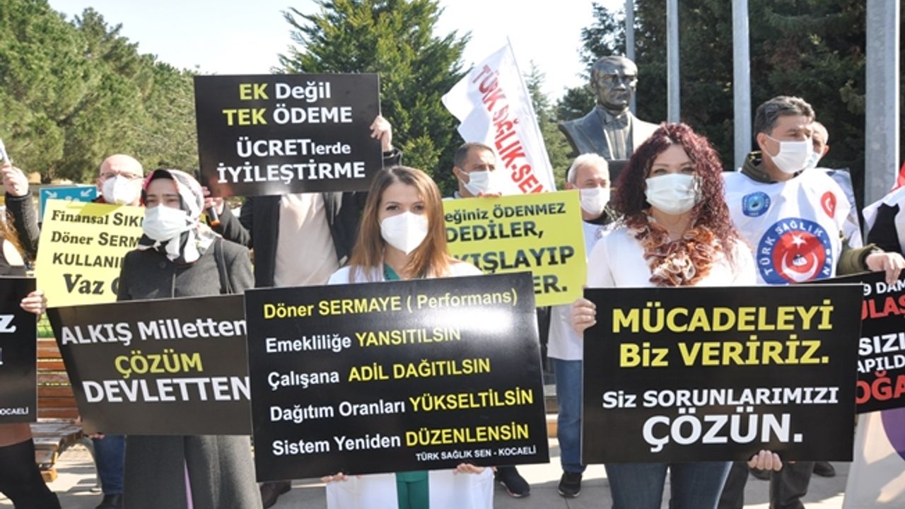 Türk Sağlık-Sen Kocaeli Şubesi Başkanı Ömer Çeker, dün S.B.Ü. Derince Eğitim ve Araştırma Hastanesi önünde gerçekleştirdiği basın açıklaması ile, sağlık çalışanlarının döner sermaye feryadını yüksek sesle dile getirdi.